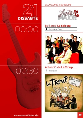 del 20 al 29 de maig del 2016 DISSABTE 00:00 Ball amb La Salseta Plaça de la Coma 00:30 Actuació de La Troup Barraques www.cassa.cat/festamajor 23