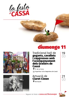 diumenge 11 Tradicional ball de 19 gegants, cavallets 00 i capgrossos amb l’acompanyament dels Grallers de Cassà Pl. de la Coma Organitza: Colla Gegantera de Cassà Actuació de 21 Claret Clown 00 Barraques Segueix la Festa a cassa.cat/festamajor 43