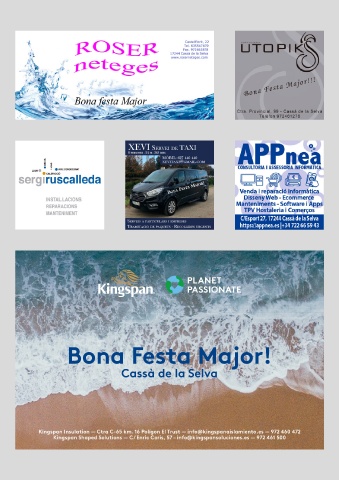 Bona Festa Major! Cassà de la Selva Kingspan Insulation — Ctra C-65 km. 16 Polígon El Trust — info@kingspanaislamiento.es — 972 460 472 Kingspan Shaped Solutions — C/ Enric Coris, 57 – info@kingspansoluciones.es — 972 461 500