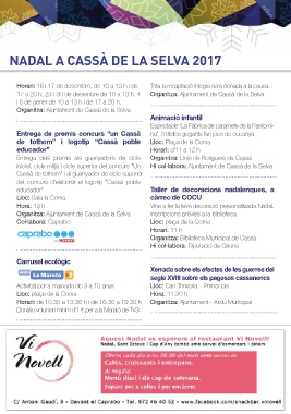 Mercat de Nadal alumnes de primària que han participat al Lloc: plaça de la Coma Hora: 11.30 h Hi col·labora: Ajuntament de Cassà de la Selva Hora: 12.30 h