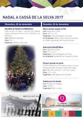 Dissabte, 16 de desembre Lloc: plaça de la Coma inicial, cicle mitjà i cicle superior del concurs “Un Hi col·labora: Ajuntament de Cassà de la Selva Lloc: Can Trinxeria-Sala d'Actes protagonitzats per l’alumnat d’ESO de La Salle Inflables a la piscina Animació infantil Rikus Després de la missa del gall Organitz