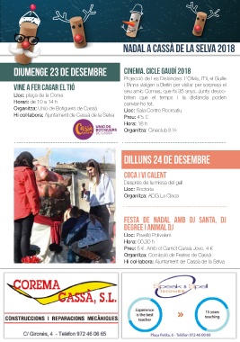 Hora: 21.30h Activitats d’AEiG La Claca Exposició 50è aniversari del Concurs Hora: 14 h Lloc: sortida, al pati de Can Trinxeria Pastorets de La Salle Cassà Hora: 20 h Lloc: plaça de la Coma Hora: 18.30 h Hi col·labora: Ajuntament de Cassà Cursa de Sant Silvestre