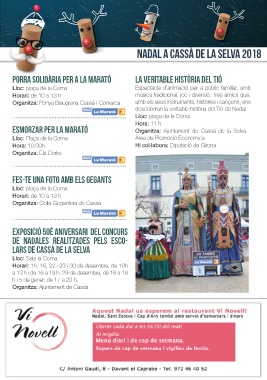 Dijous 13 de desembre Dissabte 15 de desembre Porra solidària per a la Marató La veritable història del Tió Mostra de dansa nadalenca La màgia del Nadal Xocolatada solidària Pastorets de La Salle Cassà X