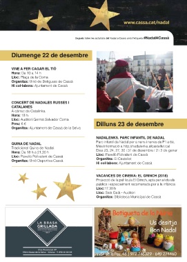 municipals de Cassà i centra la seva obra en els Tot un dia d’activitats per a tota la família relaciona- Lloc: Plaça de la Coma Lloc: Plaça de la Coma Cantates dels alumnes d’iniciació Musical de Hora: De 10 a 14 h Després de la missa de gall. Tradicional Quina de Nadal. I BESTIOLES Recepció del carte